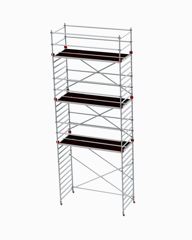 Stilladset er designet med fuldsvejste samlinger på alle rammer, hvilket sikrer ekstra styrke og stabilitet. De diagonale afstivninger og håndlister er udstyret med slagfaste kløer, som også har fuldsvejste samlinger, hvilket gør dem ekstra robuste.